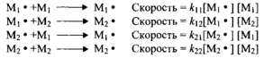 Сополимеризация может происходить в объеме фазы. Константы скорости четырех возможных путей присоединения мономера: