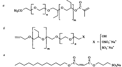 Рис. 3. Примеры полимеризующихся ПАВ: а — метакрилат блок-сополимера этиленоксида и бутиленоксида с концевой метальной группой; б—блок-сополимер бутиленоксида и этиленоксида с аллильной концевой группой и с различными группами на другом конце; в — монододецилмоно-сульфопропилмалеат