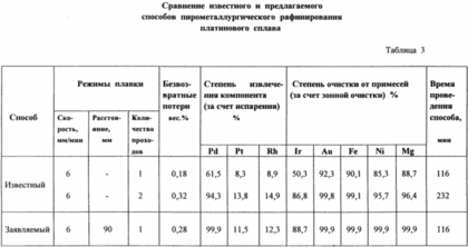 Для получения сравнительных данных, платиновый сплав, имеющий указанный конкретный состав, подвергался воздействию согласно известному способу - наиболее близкому аналогу, пирометаллургическому рафинированию в двух вариантах: вакуумной электронно-лучевой зонной плавке одним лучом за один проход и при тех же условиях обработки платинового сплава, но за два прохода. Результаты сравнительного анализа одного из примеров заявляемого способа и указанных вариантов известного способа (рис. 3).