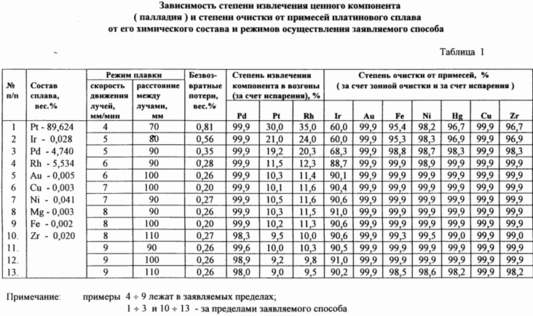 Тепловой баланс плавки двумя лучами подобран таким образом, что в области между зонами термического воздействия лучей позволяет одновременно осуществляться двум процессам: направленной кристаллизации с перекристаллизацией сплава, формирующей твердую фазу, и активному испарению ценного компонента из состава находящейся с ней в равновесии жидкой фазы. Создаваемое за счет операций режимов заявляемого способа подвижное равновесие этих процессов позволяет стабильно осуществлять разделение платины и ценного компонента.