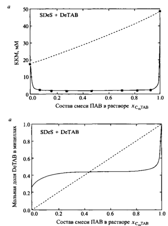 Зависимости KKM и состава мицелл смесей децилсульфата натрия и бромида децил-триметиламмония от состава раствора. Видно, что можно использовать комбинации анионного и катионного ПАВ для достижения очень высокой поверхностной активности