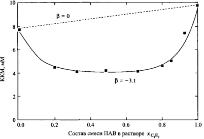 В таблице приведены значения параметра взаимодействия в для типичных смесей ПАВ. Можно отметить некоторые закономерности; например, для смесей неионных и ионных ПАВ значение в уменьшается с увеличением концентрации соли вследствие экранирования и уменьшения электростатического отталкивания. Кроме того, для смесей параметр в уменьшается по модулю с увеличением температуры, т.е. уменьшается притяжение между молекулами ПАВ разных типов.