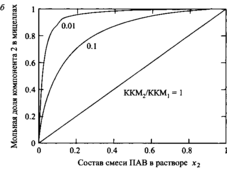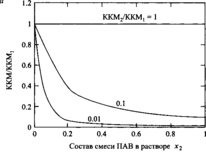 На рис. представлены рассчитанные значения KKM и мицеллярный состав как функции от состава раствора в соответствии с уравнениями для трех значений соотношения ККМ2/ККМ1 = 1, 0.1 и 0.01. Как видно из рисунка, и ККМ, и мицеллярный состав сильно зависят от состава растворов, если значения KKM компонентов сильно различаются, т.е. их соотношение далеко от 1. Следовательно, даже небольшая добавка сильно гидрофобного ПАВ может принципиально изменить свойства системы. Это обстоятельство используют при приготовлении микроэмульсий, например, вводя в систему длинноце-почечные спирты.