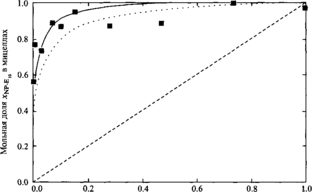 Зависимость мицеллярного состава от состава смешанного раствора системы додецилсульфат натрия + NP-Ei о. Штриховая линия соответствует одинаковому составу мицелл и раствора, пунктирная линия – результат расчета без учета взаимодействий по уравнению, сплошная линия – расчет по уравнению
