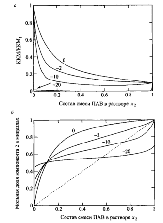 где в-параметр взаимодействия, количественно описывающий взаимодействие между молекулами ПАВ в мицелле. Положительное значение в означает, что между ПАВ действуют силы отталкивания, в то время как отрицательное значение в, наоборот, соответствует притяжению. Если в равен нулю, коэффициент активности равен единице, и уравнение переходит в уравнение. Для большинства систем в имеет отрицательное значение, что свидетельствует о преимущественном притяжении между молекулами ПАВ в смеси. Но системы с положительным значением также существуют, например смесь ПАВ с нормальными углеводородными цепями и ПАВ с фторированными углеводородными цепями.