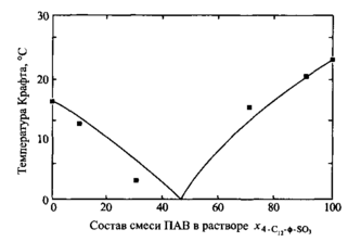 Кроме того, композиции ПАВ составляют для понижения точки Крафта. Температура Крафта является точкой плавления гидратированного ПАВ. При температурах ниже точки Крафта ПАВ нельзя использовать из-за его низкой концентрации в растворе. Некоторые системы имеют эвтектические точки Крафта, например смесь двух алкилбензолсульфонатов. Таким образом, смесь этих веществ можно использовать при температурах ниже температур Крафта индивидуальных ПАВ.