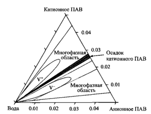 Для смесей двух противоположно заряженных ПАВ характерно более сложное фазовое поведение. Обычно наблюдается осаждение кристаллической соли двух дифильных ионов. При понижении устойчивости кристаллического состояния, например при использовании ПАВ с более короткими алкильными цепями, область осаждения сокращается или оно не происходит вовсе. В таких случаях обнаруживается множество фазовых переходов с образованием большого числа жидкокристаллических фаз. Одна из примечательных особенностей таких систем существование области термодинамически устойчивых дисперсий везикул.