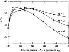 Нормальной самоорганизации индивидуального ионного ПАВ препятствует понижение энтропии вследствие конденсации противоионов. При образовании смешанных агрегатов в смесях катионного и анионного ПАВ происходит значительное увеличение энтропии. Противоионы от обоих ПАВ уходят с поверхности агрегатов. Таким образом, в противоположность ассоциации индивидуального ПАВ энтропия системы не уменьшается, что является движущей силой ассоциации катионных и анионных ПАВ в смесях. Для таких систем среднее значение числа ПАВ полностью теряет смысл. Напротив, можно говорить о немонотонном изменении КПУ с отчетливым максимумом при некотором составе композиции.