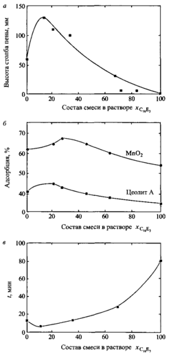 На рис. а-в представлены зависимости высоты столба пены, адсорбции на Мзи2 и цеолите А, времени смачивания хлопка соответственно смесью ПАВ, состоящей из ДСН и С16Е3. Все зависимости обнаруживают экстремумы при низком содержании неионогенного ПАВ. Таким образом, мы наблюдаем усиление поверхностной активности при добавлении более поверхностно-активного компонента C16E3. Приведенные данные служат иллюстрацией эффективности действия смесей ПАВ для увеличения поверхностной активности и, следовательно, для улучшения технологических эксплуатационных характеристик.