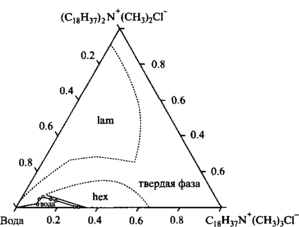 Для смесей двух одноименно заряженных ПАВ характерны гомогенные фазы, образование которых целиком определяется соотношением концентраций компонентов и фазовым поведением индивидуальных ПАВ. На рисунке 5.10 представлена фазовая диаграмма двух катионных ПАВ в воде: одно из них мицеллообразующее ПАВ с одной гидрофобной цепью, а второе – ПАВ с двумя гидрофобными цепями, склонное к формированию бислойных структур. В таком случае разобраться в фазовом поведении смеси можно на основе представлений о средних значениях критическою параметра упаковки ПАВ или спонтанной кривизны. Предположим, что общая концентрация ПАВ сохраняется постоянной и равной 50%. Будем двигаться от ПАВ с двумя углеводородными цепями в сторону одноцепочечного ПАВ, при этом обнаружим образование гексагональной жидкокристаллической фазы за счет сокращения области существования ламелярной жидкокристаллической фазы.