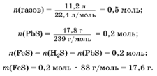 Ai(H2) = га(газов) - Ai(H2S); Ai(H2) = 0,5 моль - 0,2 моль = 0,3 моль; Ai(Fe) = (H2) = 0,3моль; An(Fe) = 0,3 моль ■ 56 г/моль = 16,8 г.