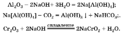 1. В концентрированном растворе щелочи растворяется только оксид алюминия с образованием комплексной соли. При пропускании углекислого газа через ее раствор эта соль разрушается и образуется гидроксид алюминия. Смесь хрома(Ш), который не растворился в растворе щелочи, при сплавлении с гидроксидом натрия образует хромит натрия: