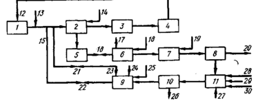 Схема этого процесса приведена на рис. 1. Поток рассола 12, прошедший через ртутный электролизер 3, из которого в аппарате 4 удален хлор, насыщается, проходя через слой каменной соли в резервуаре 1. К рассолу добавляют раствор карбоната натрия 13, после чего смесь подают в отстойник 2, в который добавляется раствор гидроксида натрия 14 и где происходит осаждение нерастворимых примесей, которые отводят в сборник 5 вместе с частью рассола (25—50 л/мин). Рассол 12 подается в ртутный электролизер 3, проходит через дехлоратор 4 и снова возвращается для насыщения в резервуар /.