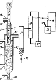 Автоматическая система поддерживает температуру этой воды постоянной (~37°С), что несколько выше температуры, соответствующей давлению паров воды при проведении процесса при давлении 6 кПа (35,8 °С). В результате этого при попадании горячей золы в воду образуется водяной пар, количество которого зависит от температуры золы и ее удельной теплоемкости. Образующийся пар перегревается горячими стенками трубы до 250 °С и, двигаясь противотоком к золе, предотвращает конденсацию ртути и таким образом ее потери с золой. Для ускорения растворения золы в воде предусмотрен насос 10, который обеспечивает интенсивную циркуляцию смеси в контейнере 9.