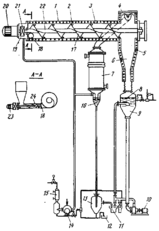 Описанная конструкция позволяет хорошо поддерживать вакуум в системе во время работ. В зависимости от температуры в выходной части печи происходит автоматическое изменение скорости вращения шнекового питателя. Шлам, подаваемый в печь, должен иметь содержание влаги не более 45—50 %; в случае необходимости его подвергают нейтрализации до получения рН = 8-5-9. Внутри цилиндрического корпуса печи вращается вал 22 со шнеком 17 для подачи сырья. Шнек оборудован специальными ножами 2, которые осуществляют перемешивание шлама в процессе обжига и исключают возможность заклинивания шнека.