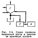 Процесс позволяет извлекать ртуть и щелочь и не приводит к загрязнению окружающей среды. Он обеспечивает безопасность работающих и не требует введения химических реагентов, приводящих к образованию нежелательных побочных продуктов и повышению стоимости обработки. Схема процесса приведена на рис. 115.