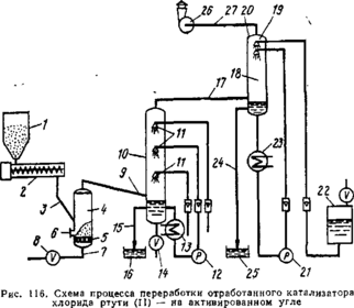 Предварительно обработанный катализатор поступает в трубу 6 и по ней в реактор хлорирования 12, в который по линии 11 подается хлор и которая подогревается нагревательным устройством 13. В реактор десорбции 7 по линии 8 подается кислород или воздух, а по линии 9 азот; скорость подачи газов контролируется расходомером 10. Реактор 7 соединен с конденсатором 14, который имеет выгружающее устройство для вывода сконденсировавшегося HgCl2. Для удаления остаточного HgCla имеется скруббер 16 с циркулирующим раствором соляной кислоты 17. Азот выводится из скруббера 16 с помощью насоса 18, который рециркулирует разбавленный раствор щелочи 19, и удаляется из системы вентилятором 20.