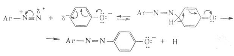 Азосочетание включает две стадии-присоединение катиона диазония к азосоставляющей и отщепление протона:
