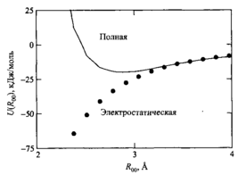Энергия взаимодействия между двумя молекулами воды, рассчитанная неэмпирическим квантовомеханическим методом. Сплошная линия - полная энергия взаимодействия U. Точками показан вклад электростатической составляющей LreIe.