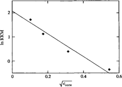Влияние концентрации соли на ККМ. Прямая линия проведена с максимальным приближением к экспериментальным данным. Теория Дебая-Хюккеля предсказывает линейность между KKM и Соли.