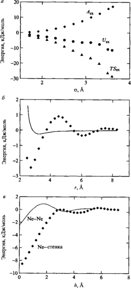 Моделирование гидрофобного эффекта методом Монте-Карло: а - свободная энергия гидратации для леннард-джонсовской частицы в воде. Параметр е принят постоянным и равным 0.62 кДж/моль; параметр у - варьируемая величина. Энтропийный и энергетический вклады показаны отдельно. б - Свободная энергия взаимодействия между двумя атомами неона в воде. Сплошная линия - то же для взаимодействия двух атомов неона в газовой фазе, в - Свободная энергия взаимодействия атома неона с гидрофобной стенкой в воде. Сплошная линия - взаимодействие двух атомов неона в воде. С разрешения American Institute of Physics