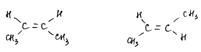 4. Геометрична, або цис-транс-ізомерів – це вид просторової ізомерії, коли ліганди по різному розміщені в просторі відносно площини подвійного зв’язку. Даний вид ізомерії властивий алкенам, у молекулах яких два атоми вуглецю з подвійним зв’язком сполучені з одинаковими або різними лігандами і зумовлений відсутністю вільного обертання навколо зв’язку С = С. У випадку, коли однакові радикали розміщуються в просторі по один бік від площини подвійного зв’язку утворюється цис-конфігурація. Якщо ці радикали розміщені по різні боки від площини подвійного зв’язку – утворюється транс-ізомер. Наприклад: