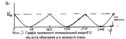 На рис. приведено графік залежності потенціальної енергії U від кута обертання в молекулі етану. Для невиходу молекули із залежності конформації в затінену необхідно затратити 12,6 кдж/моль.