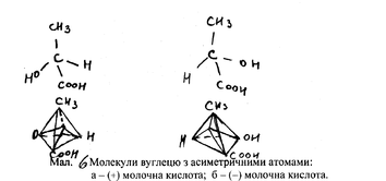 4. Молекули з асиметричними атомами вуглецю існують у вигляді правих (+) – форм (конфігурацій) і лівих (–) – форм (конфігурацій), які відрізняються різним розміщенням лігандів у просторі навколо асиметричного атома вуглецю (мал.).
