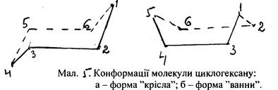 Тому в циклоалканах існує конформаційна ізомерія. Для циклогексану стійкішою буде форма крісла, так як внутрішня енергія молекули буде мінімальна.