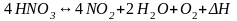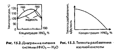 Теплота разбавления азотной кислоты водой существенно меняется с ее концентрацией и составляет для моногидрата HNO3 33,68 кДж/моль (рис. 1.3). Безводная азотная кислота малоустойчива термически и разлагается уже при хранении по уравнению: