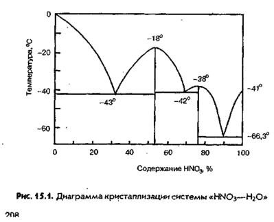 Безводная азотная кислота (моногидрат HNO3) представляет бесцветную жидкость с температурой кристаллизации -41,6°С, температурой кипения — 82,6°С и плотностью — 1,513 г/м3. Смешивается с водой во всех отношениях, образуя при этом индивидуальные соединения — гидраты состава HNO3·Н2О и HNO3 · 3Н2О, которые дают три эвтектики (рис. 1.1).