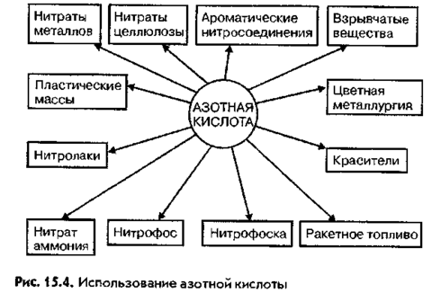 Области применения азотной кислоты весьма разнообразны. Большая часть ее (до 75—80%) расходуется на производство азотных и комплексных минеральных удобрений и разнообразных нитратов, 10—15% идет на получение взрывчатых веществ и ракетного топлива, остальное количество потребляется производством красителей, органическим синтезом и в цветной металлургии (травление металлов).