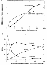 Числа агрегации ПАВ в неполярных растворителях обычно невелики. На верхней диаграмме показаны зависимости средних чисел агрегации 1-моноолеина и моноолеата сорбитана в циклогексане; на нижней диаграмме показаны зависимости долей ПАВ в виде мономеров, димеров и тримеров от концентрации ПАВ для моноолеата сорбитана в бензоле.