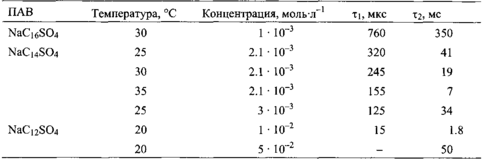 Из кинетических измерений быстрого процесса определяются два времени релаксации, характеризующие молекулярные процессы в мицеллярных растворах: фй характеризует скорость, с которой молекулы ПАВ обмениваются между мицеллами, в то время как Т2 характеризует скорость, с которой мицеллы образуются и распадаются. Примеры времен релаксации приведены в табл.2.6 Заметим, что фй имеет порядок 10 мкс для додецилсульфата натрия, а Т2 - больше миллисекунды. Оба релаксационных процесса заметно замедляются при возрастании длины алкильной цепи молекул ПАВ.