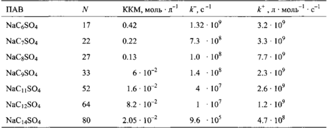 где константа скорости прямой реакции лимитируется диффузией и практически не зависит ни от размера молекул ПАВ, ни от размера мицеллы.