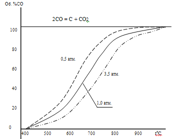 На рисунке 2 изобары %СО = ср(Т) делят поле графика на две части: левую и правую от изобары. В каждой из этих частей равновесие реакции отсутствует и возможно необратимое протекание процесса или реакции вправо (в правой части) и в левой части в обратном направлении.