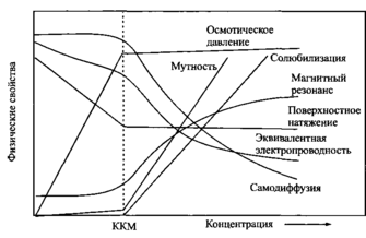 При измерении различных физико-химических свойств водных растворов поверхностно-активного вещества или липида, наблюдается ряд особенностей, которые проиллюстрированы на рис. на примере ионного ПАВ.