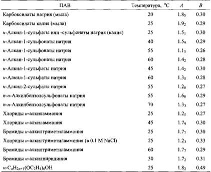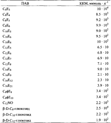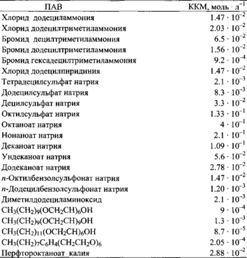 Значения ККМ, измеренные при 25°С для различных ПАВ, приведены в табл. 2.2, а в табл. 2.3 представлены аналогичные данные для ряда неионных ПАВ.