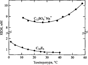 В первом приближении можно считать, что KKM мало зависит от температуры. В качестве подтверждения на рис. 2.6 представлена температурная зависимость KKM додецилсульфата натрия. KKM изменяется немонотонно приблизительно на 10-20% в широком диапазоне температур. Неглубокий минимум вблизи 25°С сопоставим с аналогичным минимумом растворимости углеводородов в воде. Неионные оксиэтилированные ПАВ ведут себя по-другому. Обычно они обнаруживают монотонное, гораздо более сильное снижение KKM с увеличением температуры. Зависимость свойств НПАВ от температуры вообще отличается от аналогичных зависимостей, установленных для ПАВ других классов. Давление мало влияет на KKM вплоть до очень высоких значений.