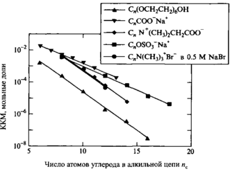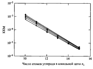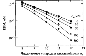 1. KKM сильно снижается с увеличением длины алкильной цепи ПАВ. Как правило, KKM снижается приблизительно в два раза для ионных ПАВ и в три раза для неионных ПАВ при увеличении алкильной цепи на одну метиленовую группу. Значения KKM для ПАВ различных классов следует сравнивать для веществ с одинаковым числом атомов углерода в алкильной цепи.