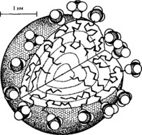 Рис. 3. Схема сферической мицеллы, подчеркивающая жидкообразной характер неупорядоченного углеводородного ядра и шероховатость поверхности мицеллы