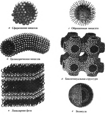 Самоорганизация поверхностно-активных веществ в растворе приводит к возникновению различных структур; некоторые из них представлены на рис. Системы, содержащие ПАВ, удобнее классифицировать на гомогенные и гетерогенные. Однофазные системы в свою очередь можно разделить на изотропные растворы, твердые и жидкокристаллические фазы. Для твердых кристаллических фаз характерны как дальний, так и ближний порядок, однако степень ближнего порядка зависит от вида фазы. Изотропные растворы характеризуются отсутствием порядка на ближних и дальних расстояниях, в то время как в жидкокристаллических фазах нет ближнего порядка, но есть определенный порядок на больших расстояниях. И в изотропных растворах, и в жидкокристаллических фазах состояние неполярной алкильной цепи можно отнести к «жидкообразному». В кристаллах, образованных ниже «температуры плавления цепи», состояние алкильной цепи можно считать более или менее «твердообразным». Начало образования мицелл — критическая концентрация мицеллообразования.