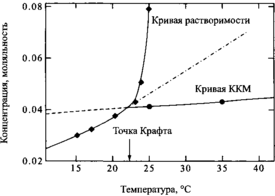 Эффект Крафта легко объясняется одновременным проявлением температурной зависимости молекулярной растворимости ПАВ и температурной зависимости ККМ. Как уже было сказано выше, KKM настолько слабо зависит от температуры, что в первом приближении можно считать, что она вообще не зависит от температуры. В тоже время распад мицелл на составные сольватированные ионы увеличивается с температурой, как это характерно для простых солей. Если такое растворение происходит ниже ККМ, мицеллы не образуются и общая растворимость ПАВ лимитируется низкой молекулярной растворимостью. Если же молекулярная растворимость достигает ККМ, то могут возникать мицеллы. Как мы увидим далее, характерная особенность процесса мицеллообразования состоит в том, что при увеличении концентрации мицелл практически не происходит изменения активности молекулярно растворенного ПАВ. Этот факт и высокая растворимость мицелл объясняют, почему при совсем небольшом увеличении молекулярной растворимости наблюдается резкое увеличение общей растворимости ПАВ.