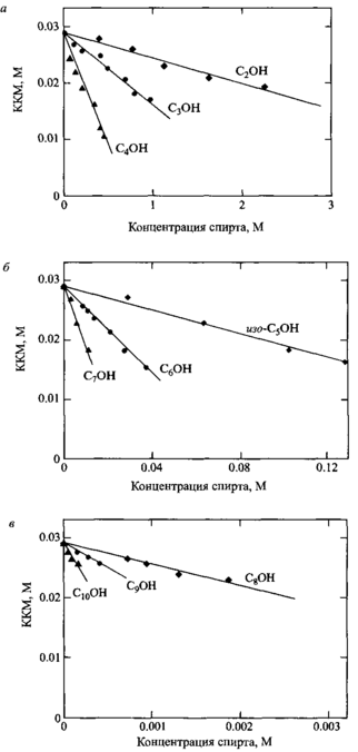 Добавление простых спиртов приводит к понижению KKM, причем понижение KKM практически линейно зависит от концентрации спирта. Наклон зависимостей резко увеличивается с уменьшением полярности спирта.