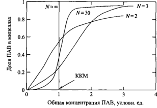 В этой модели образование мицелл рассматривается как процесс, аналогичный фазовому разделению, причем мицеллы являются новой фазой, а KKM — концентрацией насыщения раствора молекулярным ПАВ. Избыток ПАВ сверх ККМ, следовательно, влияет только на концентрацию мицелл. Эта модель мицеллообразования особенно удобна для интерпретации экспериментальных данных. В результате физико-химических измерений получают среднюю величину по различным состояниям, в которых могут находится молекулы ПАВ. Ниже KKM существуют только отдельные молекулы ПАВ, и среднее значение величины Q равно