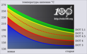 Все гликолевые тормозные жидкости гигроскопичны и со временем эксплуатации жидкость поглощает влагу из воздуха, с которым входит в контакт. Значение "новой" тормозной жидкости на графике соответствует её нормальному обезвоженному состоянию, в котором она бывает сразу после покупки, а "старой" она становиться после того, как поглотит 3,5% воды. Поскольку стандарт не знает такого класса как DOT 4.5 (на графике пунктиром), то изучение надписей на коробках и ассортимента продаваемой продукции показало, что это тот же DOT 4, с присадками позволяющими повысить некоторые характеристики, в том числе и температуру кипения. На самом деле кривая температуры кипения DOT 4.5 может располагаться во всём диапазоне пространства от красной (DOT 4) до жёлтой (DOT 5) линии, в зависимости от того, что туда напихал производитель.