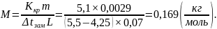 – величина, получаемая опытным путем – понижение точки замерзания раствора, состоящего из т кг растворенного неэлектролита и L кг растворителя; М – масса 1 моль неэлектролита, кг. Криоскопическая константа бензола Ккр = 5,1°.