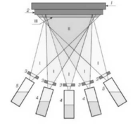 Рис. 1. Схема установки МЛЭ: I - зона генерации молекулярных пучков; II -зона смешивания испаряемых элементов; III - зона кристаллизации на подложке; 1 - блок нагрева; 2 - подложка; 3 - заслонка отдельной ячейки; 4 - эффузионнные ячейки основных компонентов пленки; 5 - эффузионнные ячейки легирующих примесей.