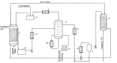 2, 12 – ємності для хлороформу; 7 – відстійник-розподільник;