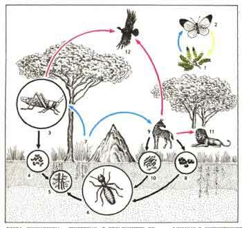 Рисунок 1. Круговорот веществ в саваннах Африки и участие в нем животных. 1 — цветы; 2 — бабочки; 3 — саранча; 4 — экскременты насекомых; 5 — корни; 6 — термиты; 7 — травы; 8 — экскременты млекопитающих; 9 — копытные; 10 — растительные остатки; 11 —хищники; 12 — птицы.